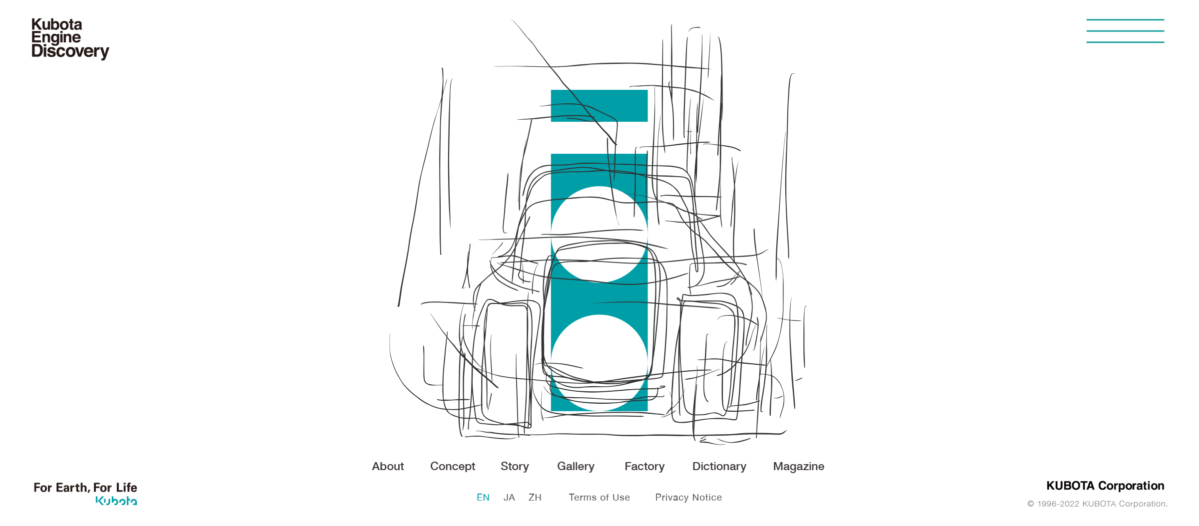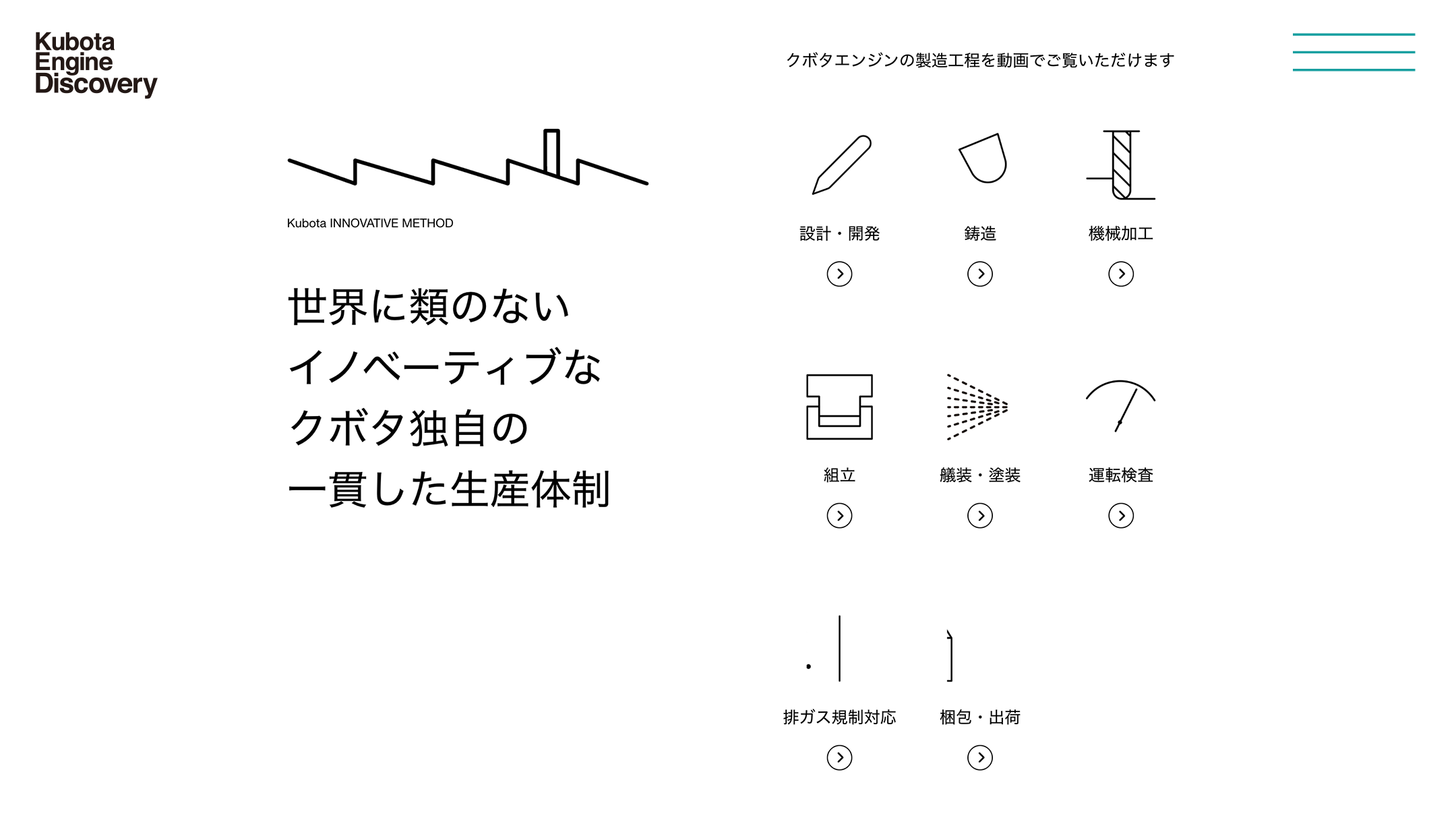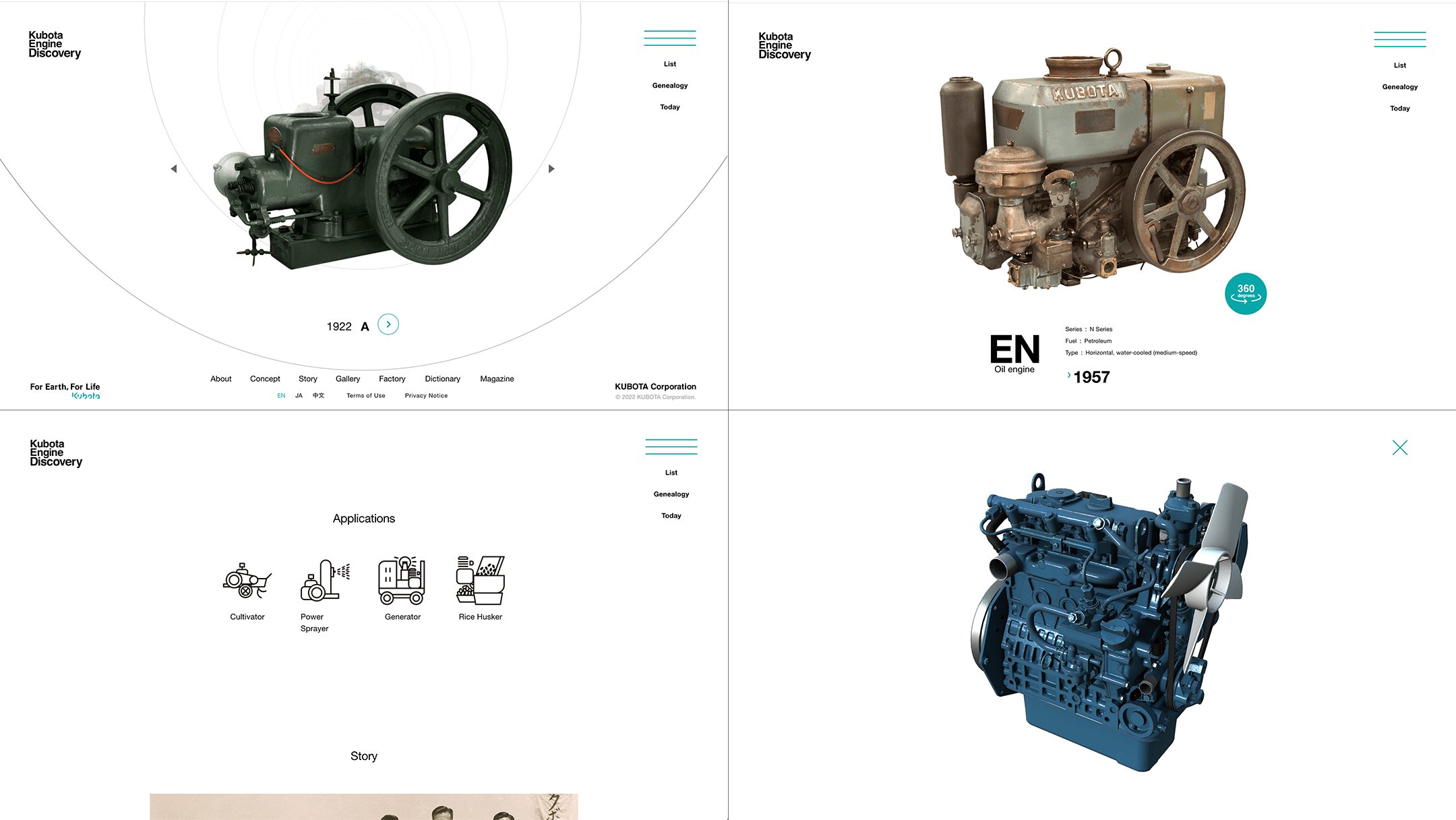 「空間や立体構造に目を奪われるのではなく、歴史や技術、想いを“きちんと読んでもらう”ことに本質がある」。そういった考えのもと、「ユーザーが自ら探す=ディスカバリーする」体験型サイトを構築しました。シンプルなインターフェイスに、クボタエンジンの歴史・エンジンの3Dギャラリー・全製造工程の映像と説明・エンジン用語辞典・多彩な読み物といったコンテンツで、クボタエンジンの100年の物語と魅力を、自由に“発見”できる空間を生み出しました。