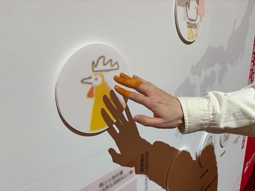 タッチパネルに触れるとアニメーションが作動し、食肉用に飼育している鶏のふんがエネルギーとして使われたり、化学飼料になったりする様子をウォール上で見ることができます。