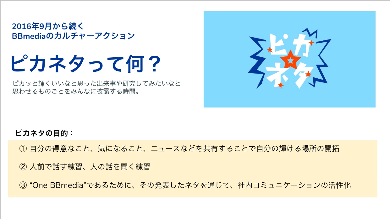 2019年9月にスタートして発表内容や運用方法なども、少しずつ改善しながら長く続いているピカネタは、ビービーメディアの心理的安全性を保つ意味でもカルチャーを維持する大事な施策になってきていると感じます。