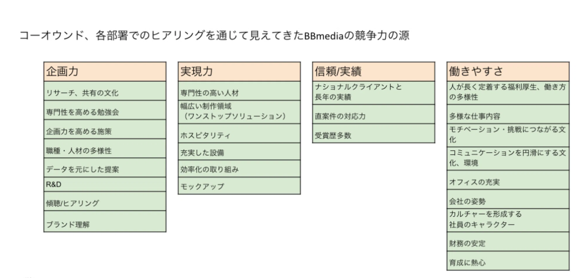 事前調査では、ビービーメディアの現状の課題を洗い出しました。そこで、大きな課題として「ビービーメディアっていろいろ制作できるのは分かったけど、強みがないよね。」 「なにが得意な会社なのかが分からない。映像なの? Webなの? テクノロジー?」などが挙がっており、ビービーメディアの強みがうまく伝わっていないのではないかと考えました。