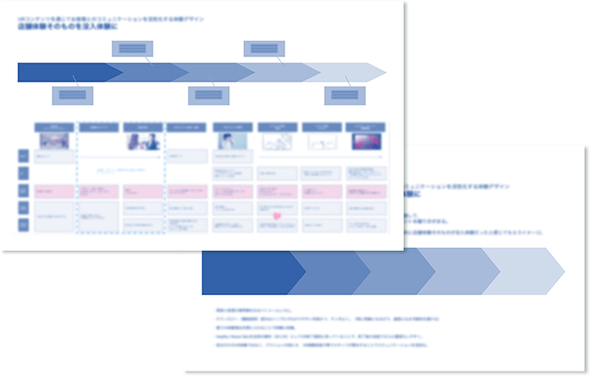 お客様の行動・気持ちを軸にして、店舗スタッフの方の行動、店内の状況、VRコンテンツの状況を時間軸でフロー化しました。コミュニケーションの発生するポイントを明確化してコンテンツに反映しています。