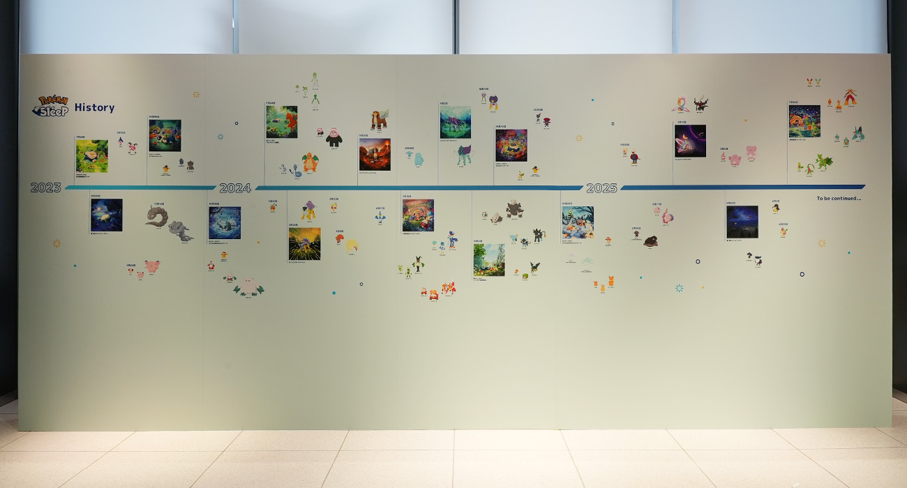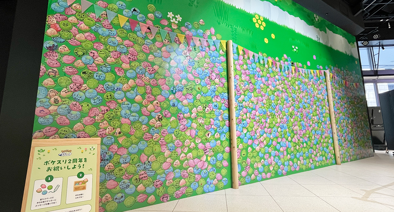 『Pokémon Sleep』を年表で振り返る!ヒストリー展示や、みんなの愛で2周年をお祝いするメッセージ展示『カビゴン広場』など、その他、会場内のエントランスやカフェなどの装飾もビービーメディアで担当しています。