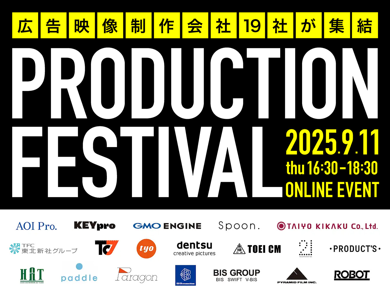 *株式会社AOI Pro、*株式会社KEY pro 、*GMO ENGINE株式会社、株式会社スプーン、 *太陽企画株式会社、*TFCグループ、株式会社テイ・シー・ジェー、*株式会社TYO、 *株式会社電通クリエイティブピクチャーズ、東映シーエム株式会社、 *株式会社21インコーポレーション、 *株式会社博報堂プロダクツ、 *株式会社ハット、 *パドル株式会社、 *株式会社パラゴン、 *ビービーメディア株式会社、 *株式会社ヴィス、*株式会社ピラミッドフィルム、*株式会社ロボット