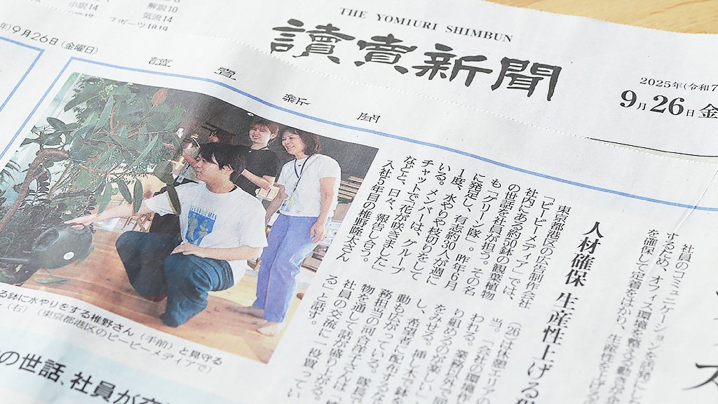 9月26日の読売新聞朝刊14面にて、オフィスの植木の世話を続けるボランティア活動、「グリーン隊」の活動が掲載されました。