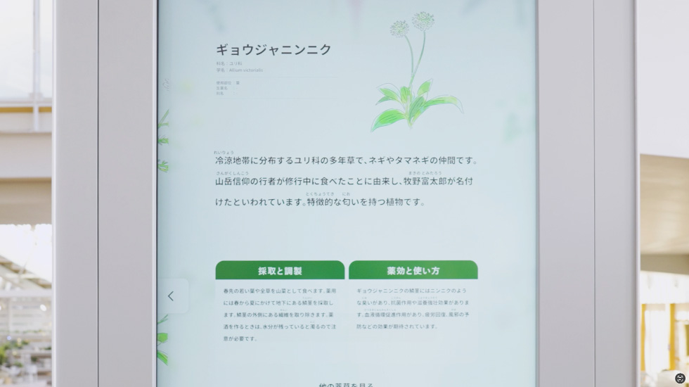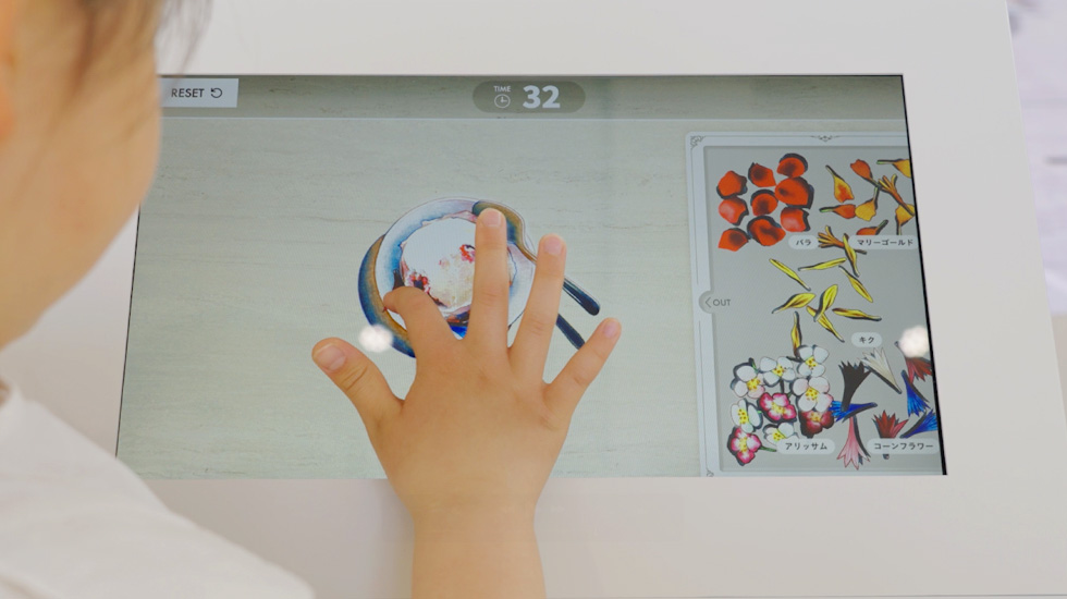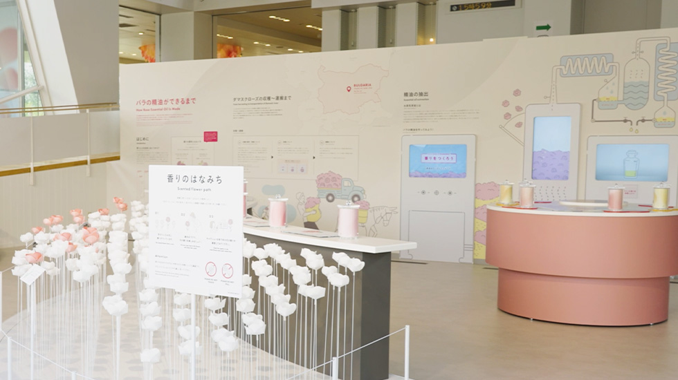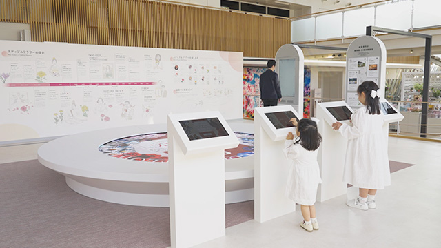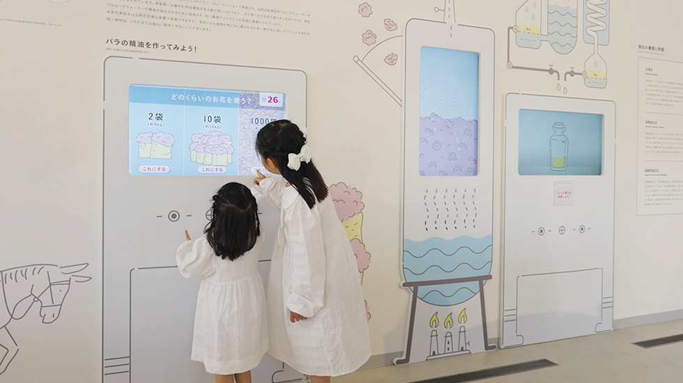 岐阜県可児市にある、世界に誇るバラと花々の大庭園「ぎふワールド・ローズガーデン」。 その庭園内にある施設「花と暮らしのギャラリー」のリニューアルに伴い、 弊社では施設コンセプトを起点とした複数の体験展示において、体験設計・演出・イラストデザイン・実装開発を担当しました。 「花と暮らしのギャラリー」は、花の“香り・色・食”をテーマにした体験展示や情報展示を通して、日常の暮らしを豊かに彩る花やみどりにまつわる「気づき」を届ける体験施設です。 ●情報展示 バラの精油ができるまで アロマや香水の原料となる「バラの精油」がどのようにできるのかを紹介するグラフィックウォールです。 精油ができる工程を、イラストを多用した静的なグラフィックでわかりやすく解説。 さらにグラフィック内に設置されたディスプレイでは、必要なバラの量や水の量を、デジタルコンテンツで体験的に学べます。 ●オハナウォール 大型ディスプレイに表示される花言葉に手をかざすと、 その言葉がビジュアルとなって花が咲き出すインスタレーション。 春夏秋冬の花と花言葉を楽しめるだけでなく、 手の動きに連動する水流のような映像と音楽により、癒しの時間を提供します。 ●エディブルフラワープレート 食べられるお花「エディブルフラワー」について学びながら、 料理に花を自由に盛り付けて、自分だけのフラワープレートをつくる体験コンテンツです。 お皿に見立てた大きなディスプレイを、家族や友人と囲んで楽しむことができ、 完成したプレートは写真スポットとして撮影も楽しめます。 ●薬草ライブラリー ディスプレイに表示される体調や症状を選ぶと、 かわいらしいピクトグラムとともに、それに合った薬草を学べる検索ライブラリーコンテンツです。 「花と暮らしのギャラリー」の空間全体の世界観に寄り添いながら、 どなたでも楽しめる優しく親しみやすいインクルーシブなデザイン・演出を心がけ、 来場された方が、花の“香り・色・食”への興味を深め、 花をより身近に感じ、好きになるきっかけとなるような体験デザインを目指しました。