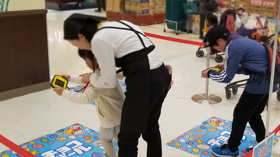 森永製菓様のイースターイベントで、自社開発のARゲーム「SEEKAR」をアレンジしてご利用いただきました。 専用のマーカーをかざして、町の中に隠されたタマゴを見つけると中からキョロちゃんが飛び出します。 全国店舗で使用するため、スマホ200台を用意し、専用のスマホケースも製作しました。 当日のイベントでは、お子さまからお年寄りまで親子三世代で楽しんで頂くことができました。
