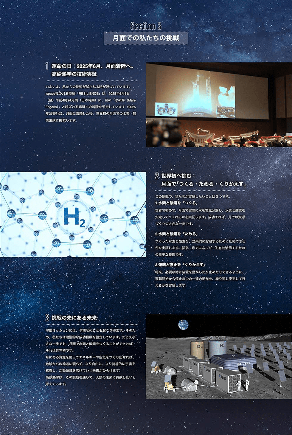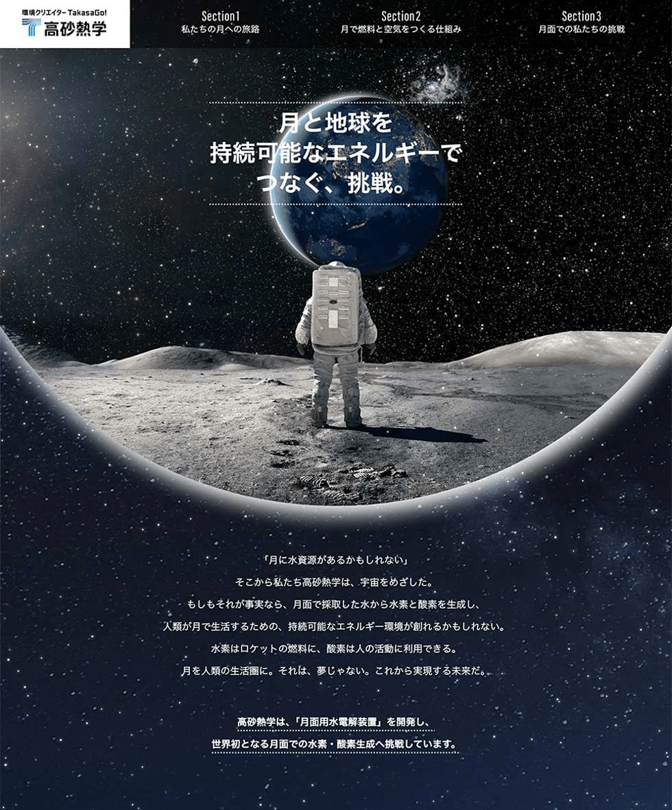 高砂熱学は、空調設備エンジニアリングの会社として、人々の快適な生活空間を作り上げてきた会社です。 2025年1月、月面での持続可能なエネルギー環境の構築を目指し、その挑戦を地球から宇宙へと広げました。 このサイトは高砂熱学の宇宙への構想、挑戦、未来を紹介するため、「月面用水電解装置」が月面へ辿り着く2025年6月6日を前に公開されました。 高砂熱学の宇宙へ真摯に挑戦する姿勢を、月面から人々が暮らす地球を見つめる宇宙飛行機の背に重ねたデザインです。 全体は4つのセクションで構成され、テーマによって背景を変化させるなど、内容に応じて変わりゆく世界観を楽しみながら読み進めていけるような演出を工夫しています。